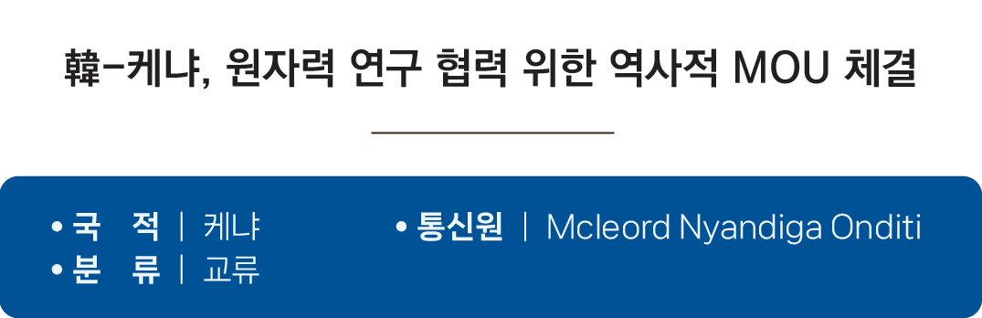 이번 MOU를 통해 케냐는 에너지 안보, 보건 혁신, 농업 효율화, 산업 경쟁력 강화라는 국가적 목표를 달성할 수 있는 새로운 기회를 얻었다. 한국 역시 아프리카와의 협력을 심화시키는 전략적 성과를 거둘 수 있었다. 케냐가 2034년 첫 원자력 발전소를 가동하기까지 이번 협력은 기술적 탁월성과 안전, 지속가능한 발전을 보장하는 핵심 동력이 될 것으로 기대된다. |