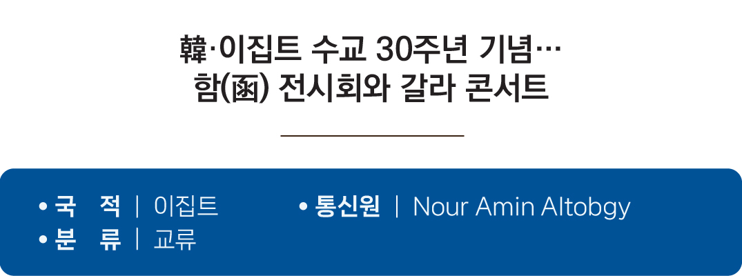 전시는 1995년 수교 이후의 외교 문서와 교류 기록을 비롯해 한국의 무형문화유산, 이집트의 파피루스 예술, 양국의 현대 공예품 등으로 구성됐다. 전시 중심에는 양국 관계의 출발을 상징하는 작품인 ‘고요(Calmness)’가 자리하고, 주변에는 전통 ‘함’을 현대적으로 재해석한 작품들이 함께 전시됐다.