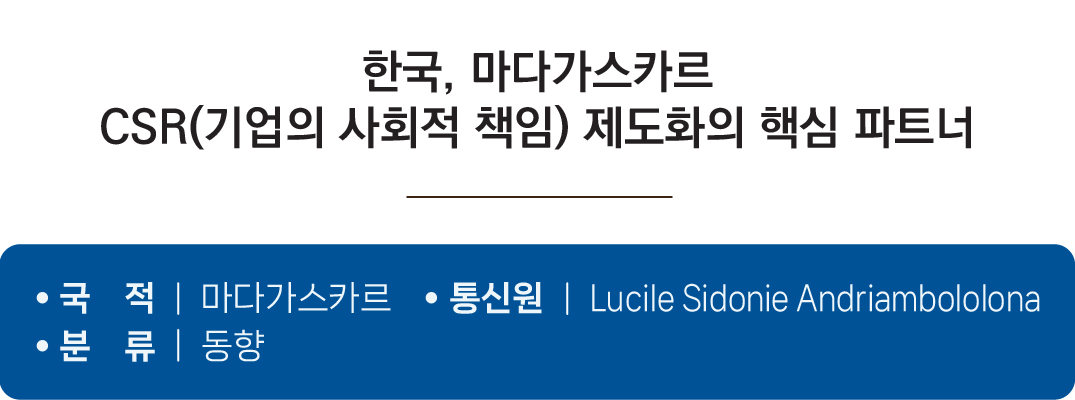 한국은 마다가스카르의 CSR 전환 과정에서 핵심 파트너로서 경험과 모범 사례를 공유하고 있다. 주마다가스카르한국대사관은 지난 9월 ‘더 나은 비즈니스 환경을 위한 CSR(CSR in the Service of a Better Business Environment)’ 워크숍을 개최해 한인 기업과 CSR 전문가들이 참여한 가운데, 국제 기준에 따른 CSR 실행방안과 마다가스카르의 규제 개선 방향을 논의했다.