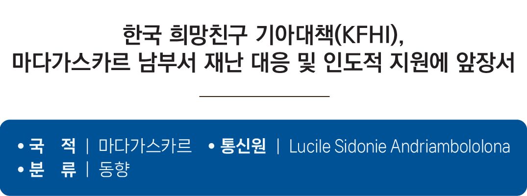 이런 배경에서 한국 희망친구 기아대책(Friends of Hope, Korea Food for the Hungry International, KFHI)은 한국국제협력단(Korea International Cooperation Agency, KOICA)의 재정 지원을 기반으로 마다가스카르 남부에서 인도적 지원, 지역사회 개발, 기후 대응 사업을 추진하고 있다. KFHI는 영양 개선과 식량 안보, 기후 변화 대응을 핵심 과제로 삼고, 국가영양청(National Nutrition Office, ONN)과 협력해 영양 강화 식품을 보급하고 아동 영양 인식 개선 캠페인을 진행하며, 사업 성과를 측정하는 모니터링 시스템도 운영 중이다. 아울러 가뭄 피해 지역을 대상으로 한 긴급 지원과 기후 적응 훈련을 통해 단기 구호를 넘어 장기적 자립 기반을 마련하고 있다.